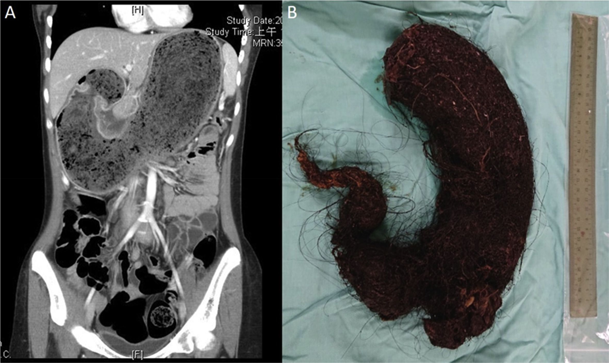 Rapunzel syndrome is also known as trichobezoar. It is a condition characterized by ingestion of hair which eventually leads to gastric outlet obstruction and other abdominal symptoms. Rapunzel syndrome is associated with trichotillomania, depression, body dysmorphism, trichophagia, and prior surgeries. Rapunzel syndrome presents with complaints of: - anorexia - weight loss - vomiting - alopecia - acute epigastric pain Reference: https://radiopaedia.org/articles/rapunzel-syndrome-1 Image via: https://www.pediatr-neonatol.com/article/S1875-9572(19)30520-0/fulltext