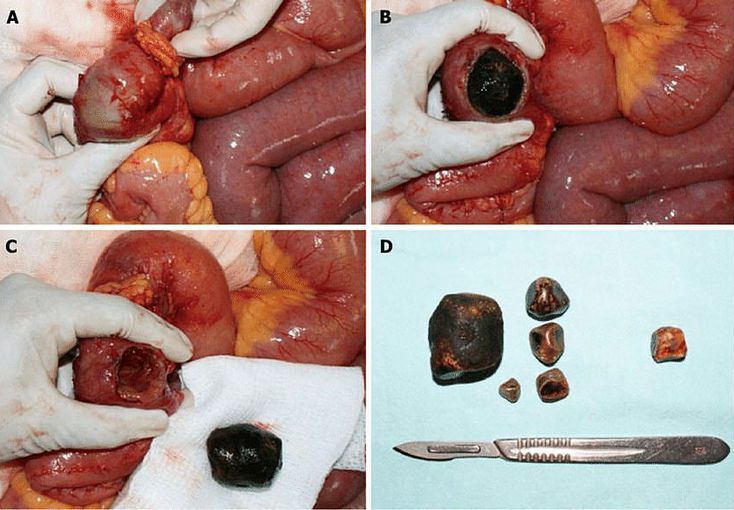 Gallstone ileus occurs when a gallstone passes through a billiary-enteric fistula into the small bowel. As the stone advances it may cause intermittent “tumbling” obstruction with diffuse abdominal colicky pain and vomiting until finals lodging in the ileum, the narrowest section of the bowels, several days later. This image shows the surgical findings in a patient with gallstone ileus. A: An impacted gallstone was found in distal jejunum. A smaller gallstone proximal to the impacted one is observed; B: Enterotomy over the site of the impacted gallstone; C: Intestinal wall compromise due to gallstone impaction can be observed; D: The offending gallstone, plus four of smaller dimensions found in proximal jejunum. An obstructing gallstone was found and extracted from the common bile duct in the same patient (gallstone on the right). Enterolithotomy is the most commonly surgical procedure performed. Through an exploratory laparotomy, the site of gastrointestinal obstruction is localized. A longitudinal incision is made on the anti mesenteric border proximal to the site of gallstone impaction. When possible, through gentle mani pulation the gallstone is brought proximally to a non edematous segment of bowel. Most of the times, this is not possible due to the grade of impaction of the gallstone. The enterotomy is performed over the gallstone and it is extracted. Careful closure of the enterotomy is needed to avoid narrowing of the intestinal lumen and a transverse closure is recommended. Bowel resection is sometimes necessary, particularly in the presence of ischemia, perforation or an underlying stenosis. Manual propulsion of the gallstone through the ileocecal valve should be reserved for highly selected situations because of danger of mucosal injury and bowel perforation. Similarly, attempts to crush the gallstone in situ can damage the bowel wall and should be avoided. Multiple gallstones can generally be extracted through a single incision by clearing the gut and moving smaller gallstones towards bigger ones.
