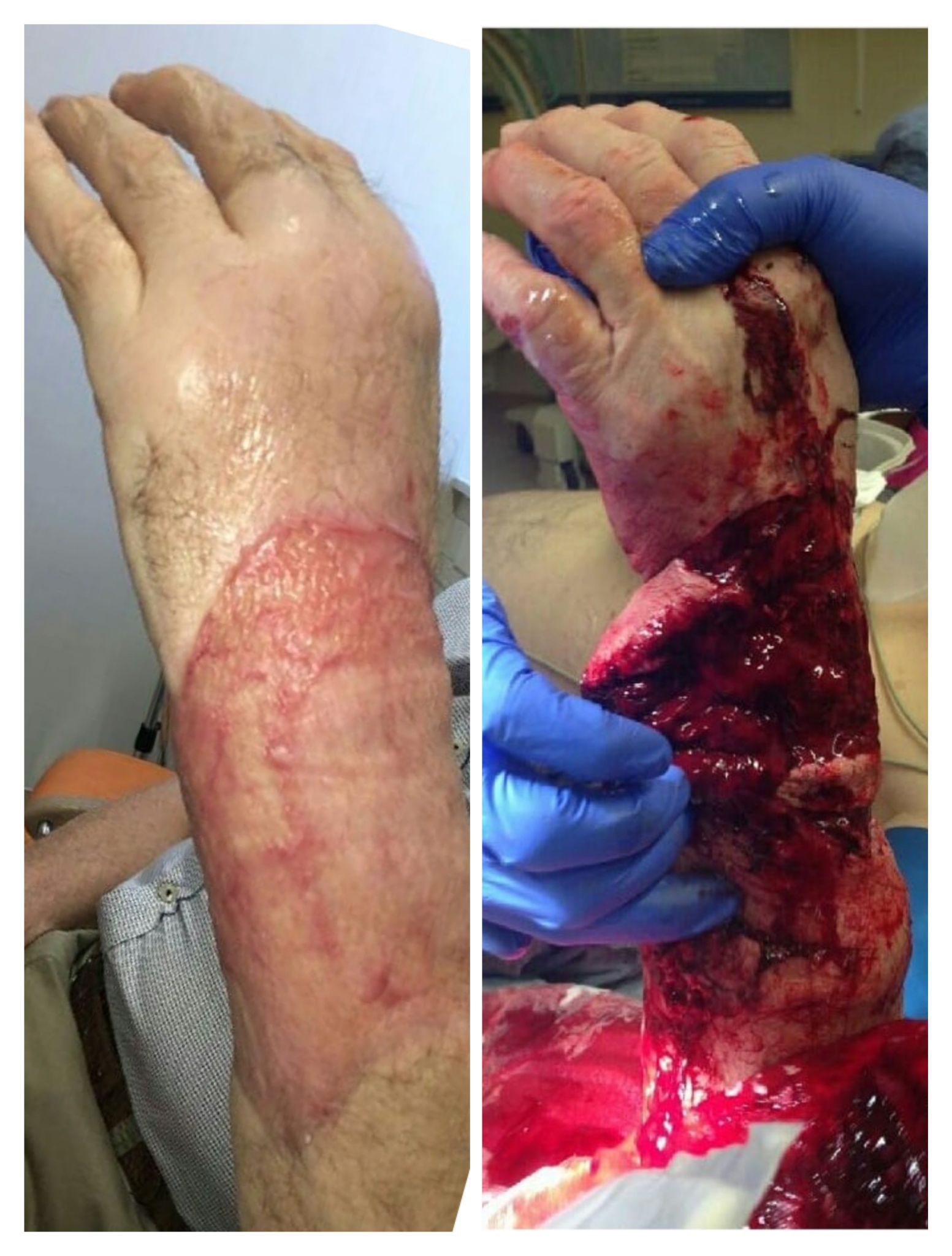 A 70 year old Male drove slowly (30 km/h - 20mph) into a ditch and rolled over with his left arm hanging out of the window. He was transferred from the hospital to a trauma center with plastic surgery. The patient needed a muscle graft taken from his back and skin grafts taken from a thigh was used. He has no neurological deficits and only minor motor limitations By:https://www.instagram.com/p/Br7yGnih2U-/?utm_medium=copy_link