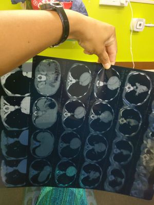 A 8 year old male child with history of chronic intermittent cough and shortness of breath on exertion had hematemesis 1 week ago. Clinical investigations were started and CT was done. Previous treatment unavailable. what is being SEEN in the scan? what could be the probable diagnosis? Child has been sent for biopsy to interrogate further.