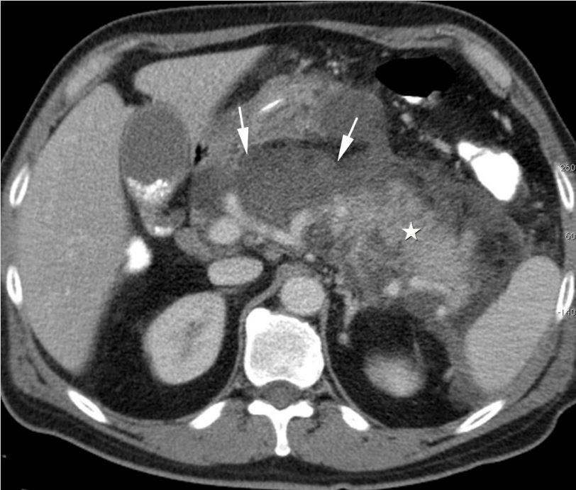 The typical features of acute pancreatitis on CT scan are as follows: - focal / diffuse enlargement of parenchyma - altered density secondary to edema - indistinct margins of pancreas secondary to swelling - retroperitoneal fat stranding Reference: https://radiopaedia.org/articles/acute-pancreatitis Image via: https://www.pancreapedia.org/reviews/imaging-assessment-of-etiology-and-severity-of-acute-pancreatitis