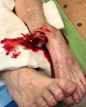 This elderly patient stepped awkwardly off of a 2 foot rock wall resulting in this compound dislocation. When she arrived at the Emergency Department she was fully awake and friendly and talkative. She was unable to move her toes at the time and pulses were faint in the foot. After X-rays were done the ER physician was able to manipulate the foot back into place. Surprisingly, aside from the graphic skin tear and bone protrusion, there were no other breaks and all major tendons, ligaments, veins/arteries were not compromised. Due to the bone being exposed to dirt and debris she was started on antibiotics and still visited the operating room for a washout, further inspection of injury and stabilization. The treatment consisted of wound irrigation, debridement, reduction, and suture of the skin, followed by immobilization with a short leg cast. The ankle was immobilized in a neutral position for 8 weeks, and weight bearing was restricted for the first 6 weeks. Open ankle dislocation without an associated fracture is an extremely rare injury due to the strength of the collateral ligaments and the capsular reinforcements of the mortise capsule. They are often open because of the thin layer of tissue that lies over the malleoli. During a traumatic event, forces are placed on the ankle that cause the bones to fracture or the ligaments to tear, resulting in the dislocation injury. The ankle is an inherently stable joint and the direction of the dislocation depends upon the position of the foot and where the force arises. Most commonly, a dislocated ankle is associated with fractures of the distal ends of the tibia and fibula (called the malleolus) in association with damage to the ligaments that help support the ankle joint. Photo: @kevinabdon