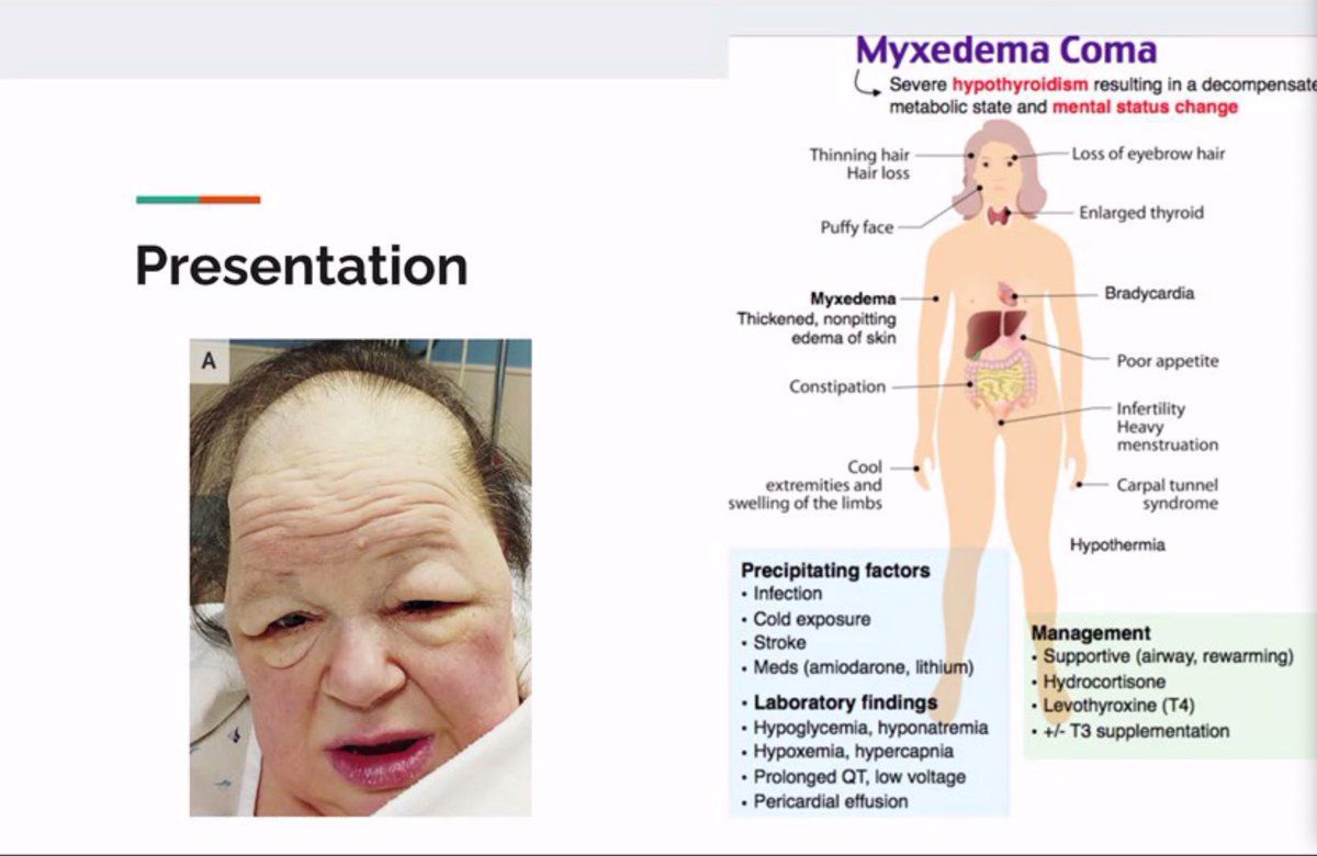 Myxedema coma is a clinical manifestation of severe hypothyroidism. The patient is usually elderly with myxematous facies i.e., loss of lateral eyebrows, periorbital edema, etc. The patient may also have seizures and hypothermia. Laboratory investigations indicate hyponatremia and hypoglycemia. The management of myxedema coma is liothyronine along with conservative measures such as warm blankets to prevent and treat hypothermia. Reference: https://www.uptodate.com/contents/myxedema-coma