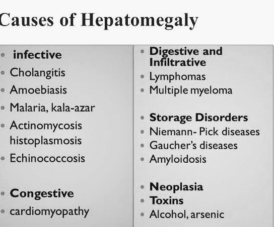 The attached image describes the infectious, metabolic, and congestive causes of hepatomegaly. Storage disorders and toxins associated with hepatomegaly are also mentioned. Image via: https://ptmasterguide.com/2019/11/03/hepatomegaly/