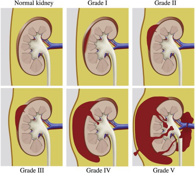 Grade I: non-expanding subcapsular hematoma Grade II: Laceration < 1 cm. Hilum is not involved. No extravasation of urine. Grade III: Laceration > 1 cm. No extravasation of urine. Grade IV: Laceration extending into the collecting system. Hilum is involved but hemorrhage is limited. Grade V: Avulsion of hilum leading to devascularization of kidney. Kidney is completely shattered. Reference: https://www.researchgate.net/figure/AAST-Renal-Injury-Grading_tbl1_264424381 Image via: https://www.sciencedirect.com/science/article/pii/S2221618915000827