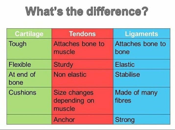 Differences between cartilages, tendons and ligaments