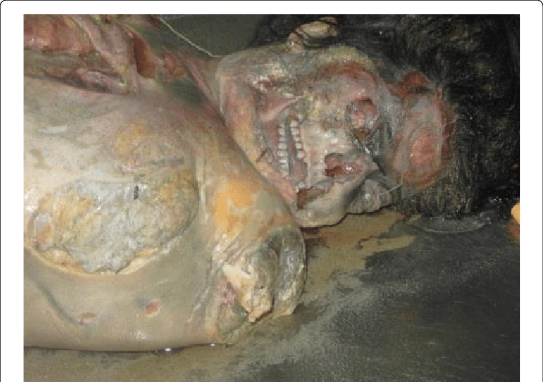 Physiologically, death has 5 phases. There are pallor mortis, algor mortis, rigor mortis, livor mortis, and putrefaction. Putrefaction is characterized by green discoloration of the body along with foul odor. Putrefaction occurs as a consequence of bacterial action of cellular components. Due to production of gas by bacterial reactions, there is usually visible distension of chest and limbs. Reference: https://en.wikipedia.org/wiki/Putrefaction#Approximate_timeline Image via: https://www.researchgate.net/publication/328733863_Postmortem_Injuries_on_Illegal_Migrants%27_Cadavers_at_the_Eastern_Land_Borders_of_the_European_Union-Greece_Open_Access_Short_Communication/figures?lo=1