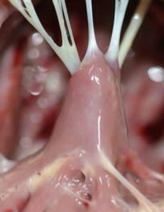 Chordae tendineae: Thread-like bands of fibrous tissue which are attach on one end to the edges of the tricuspid and mitral valves of the heart and on the other end to the papillary muscles, small muscles within the heart that serve to anchor the valves.