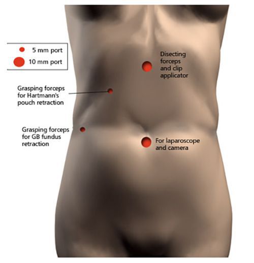 Four ports are made for laparoscopic cholecystectomy. Two of these ports are 10 mm whereas 2 ports are of 5 mm. - First 10 mm port It is a camera port. This port is also used for insufflation. - Second 10 mm port This port is made in epigastrium. - First 5 mm port This port is present below subcostal margin on right side. It is a port for maryland grasper - Second 5 mm port This is another grasping port Reference: https://emedicine.medscape.com/article/1582292-technique#:~:text=Novitsky%20et%20al%20concluded%20that,patients%20undergoing%20elective%20laparoscopic%20cholecystectomy. Image via: https://msurgery.ie/home/operative-procedures/major-procedures/general-surgery/laparoscopic-cholecystectomy/