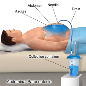 PROCEDURE Prior to tap Before tapping, there are certain investigations that should be undertaken: ➢FBC and clotting screen - if thrombocytopenia is present and severe, most clinicians would give pooled platelets to reduce the risk of bleeding. Fresh frozen plasma may be used if there is evidence of coagulopathy. ➢U/E, creatinine, and LFTs. ➢Abdominal ultrasound - this is not always necessary prior to tap. It is used to review liver, pancreas, spleen and lymph nodes. Ultrasound is a very sensitive means of assessing the extent of ascites and may also show the causative pathology such as carcinoma of ovary or metastatic liver disease. Technique ➢Check that the correct equipment has been assembled: ➢Explain the procedure to the patient, including risks, and obtain consent. ➢Position the patient, usually in the supine position with the head of the bed elevated to allow fluid to accumulate in the patient's lower abdomen. Position of the tap: ➢Locate area of flank dullness lateral to the rectus abdominis muscle and go approximately 5 cm superior and medial to the anterior superior iliac spines. ➢Avoid the inferior epigastric vessels which run up the side of the rectus abdominis to anastomose with the superior epigastric vessels coming down. ➢Avoid the pelvic area, solid tumour masses, prominent superficial veins (caput medusa) and scars (may have collateral vessels close by or adherent bowel beneath). ➢Using local anaesthetic if needed, the needle is inserted and fluid aspirated. ➢If this does not work then ultrasound guidance may help, especially for a small amount of ascites. ➢10-20 ml of fluid can be aspirated for diagnostic purposes. ➢If a therapeutic tap is required, an IV cannula is placed using the Z track technique. This involves puncturing the skin perpendicularly and advancing the needle obliquely in subcutaneous tissue. This reduces leakage following the procedure, as the puncture site on the skin and the peritoneum are not adjacent. ➢Once the cannula is in place the needle is withdrawn and a giving set and collection bag connected. Drain for 6-8 hours and then remove the cannula or catheter and cover with a simple adhesive bandage. ➢Swift drainage is safest but if the patient develops symptoms of hypotension then the drainage may need to be slowed or prematurely terminated. ➢Large volumes can be taken off within 2-4 hours but this can reduce both the intra-abdominal and inferior vena cava pressure. In response the cardiac output may increase. This may lead to a reduction in blood pressure and should be anticipated at the outset. In practice colloid replacement is usually given.