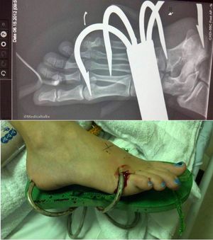 While most people are suffering from fishhook injuries, which are small and only penetrate superficially, this patient was unlucky to have this large shark hook deeply embedded in her foot! Although this hook can not be missed easily, identification of a other smaller fish hooks can be difficult, depending on the type and location of the wound and the timing and mechanism of injury. Soft tissue foreign bodies most commonly occur secondary to penetrating or abrasive trauma, and they can result in patient discomfort, deformity, delayed wound healing, localized and systemic infection, and further trauma during attempts at removal. Physical examination of the affected area should adequately assess for nerve, tendon, vessel, and joint involvement. Adequate local anesthesia and proper irrigation are important factors in controlling the pain and reducing the risk of would infection upon and after the removal of the foreign object. Large volumes of irrigant (sterile isotonic saline) at sufficient pressures is needed to reduce or eliminate particulate matter and foreign bodies, which, if left in the wound, can reduce the inoculum of bacteria required to cause infection. No single technique is best for the removal of foreign bodies. Each case is addressed independently based on the patient’s medical history and the clinical presentation of the wound.