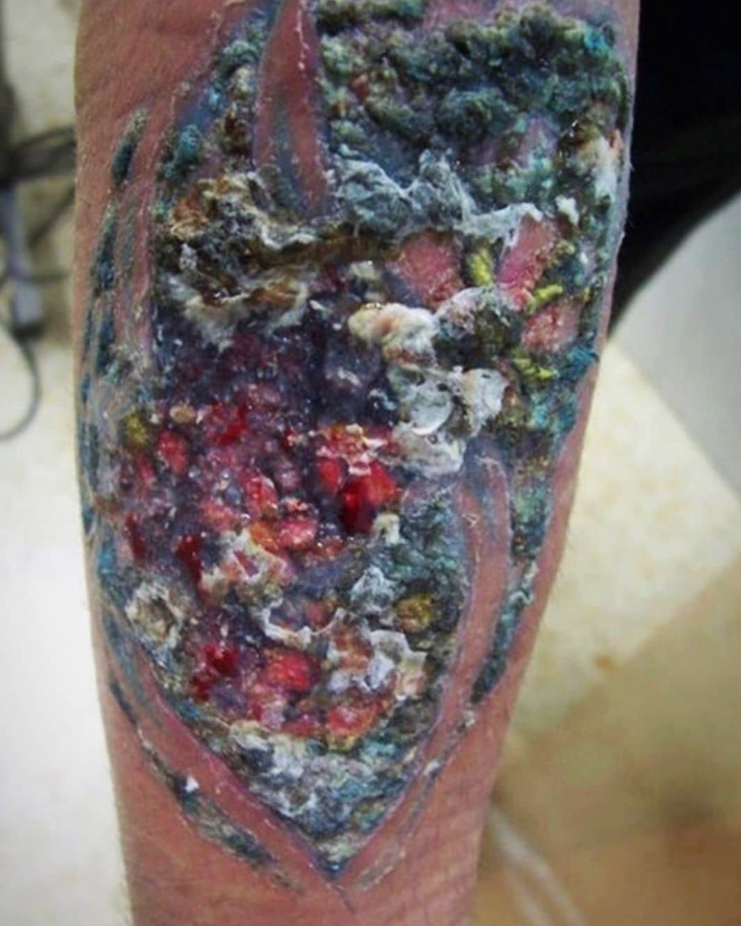 This photo shows a severe bacterial infection that occurred after receiving a tattoo with needles that were not properly sterilized. Dirty needles are the most common cause of tattoo infections. Infection is also possible if the technician is inexperienced and fails to wash their hands, put on sterilized gloves, or forgets to clean the skin carefully before the tattoo is applied. In this case, the bacterial infection was MRSA (Methicillin-resistant Staphylococcus aureus).