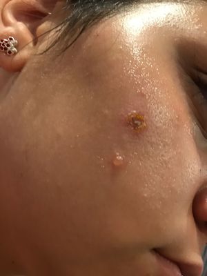 face started show a small bump that turned to blister and give an itch (blister is shown on the bottom) and even when touched lightly it popped and turned into a small scab. it got bigger within the next day.