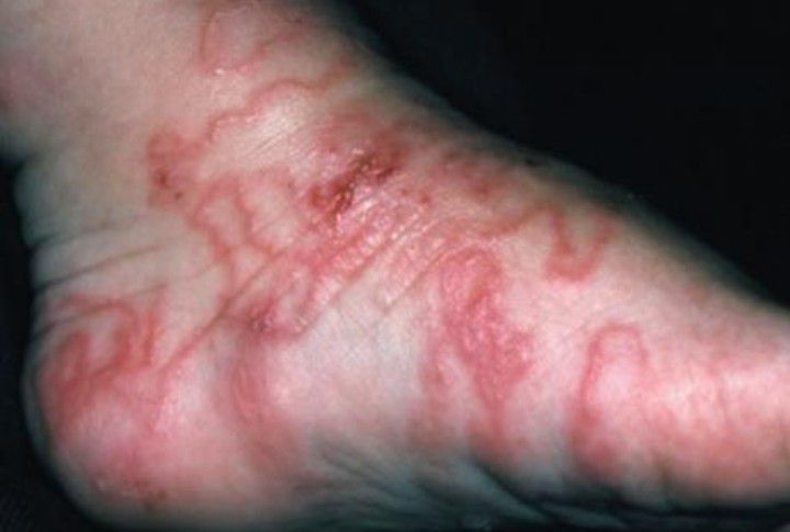 Acylostomia canium(hookworm) causes serpiginous rash on the skin. These Creeping eruption causes severe itching, blisters, and a red growing, winding rash. The rash can grow up to 1 to 2 centimeters per day.