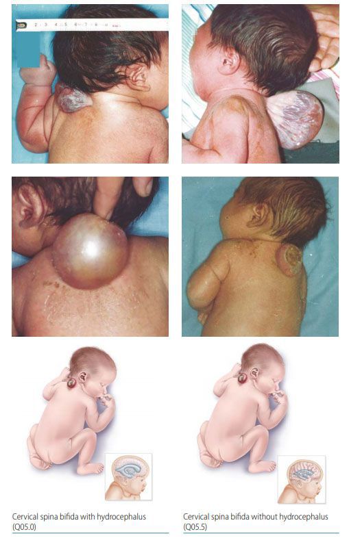 Spina bifida is a neural tube defect. It is characterized by herniation of spinal cord along with meninges or herniation of meninges only. Protrusion of spinal cord and meninges is referred to as myelomeningocele. Herniation of meninges is referred to as meningocele. Most common complication of spina bifida is hydrocephalus. Supplementation with folic acid before conception and antenatally significantly reduces the risk of neural tube defects. Reference: https://www.cdc.gov/ncbddd/birthdefects/surveillancemanual/quick-reference-handbook/spinaBifida.html Image via: https://www.cdc.gov/ncbddd/birthdefects/surveillancemanual/quick-reference-handbook/spinaBifida.htmlq