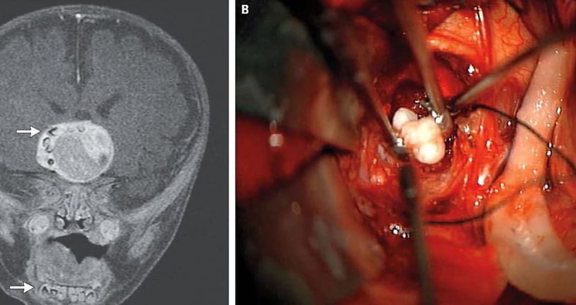 It's not entirely unusual for a 4-month-old baby to have a few teeth, unless those teeth are lodged in the baby's brain. An infant in Maryland had teeth form in his brain as a result of a specific type of rare brain tumor. Doctors were able to remove the tumor and the boy made a full recovery, according to a report published in the New England Journal of Medicine in February 2014. Doctors suspected something might be going on inside the boy's brain when his head appeared to grow faster than was usual for his age. A scan of the child's brain revealed a tumor that contained what looked like teeth normally found in the lower jaw. And indeed, when doctors removed the tumor they extracted several fully formed teeth with it. While teeth do sometimes appear in tumors, the type of tumor removed from the infant's brain — a craniopharyngioma — wasn't known to host these strange additions.