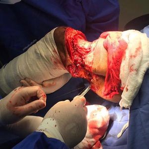 Above-the-knee leg amputation on a 57-year-old patient who had a 6 years history of diabetes which was complicated with atherosclerosis of the lower limb and eventually lead to an irreversible gangrene. The leading indication for limb amputation is ischemic disease such as a peripheral vascular disease or PVD for short (a severe disease of the circulation such as an atherosclerotic process), primarily in elderly persons with diabetes mellitus, who often experience peripheral neuropathy that progresses to trophic ulcers and subsequent gangrene and osteomyelitis. Limb removal for PVD is performed for uncontrollable soft-tissue or bone infection, nonreconstructable disease with persistent tissue loss, or unrelenting rest pain due to muscle ischemia. Foot or leg ulcers may develop due to diabetes and not heal. They may become infected, and the infection may spread to the bone and become severe enough to be life threatening. The surgical decision in that case is an above-knee amputation, which is performed when lower-level surgery is prohibited in order to remove the diseased tissue and prevent further spread of infection. Although a diseased limb can be removed quite readily, resolving the problem of the extremity, the care does not end there. The surgery must be performed well to ensure that the patient is able to wear a prosthesis comfortably.