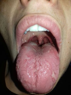 Fissured tongue - genetic and related to the wet or dry ear wax gene. No problems with it I have one too and my brother