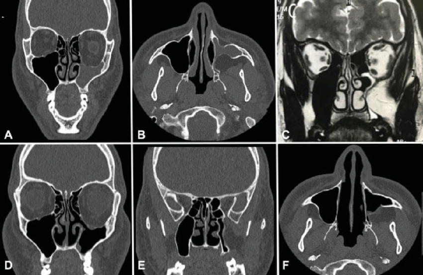Silence sinus syndrome refers to the consequences of asymptomatic chronic maxillary sinusitis. Collapse of the orbital floor can lead to enophthalmos or hypoglobus. One of the major risk factor is anomalies of nasal structure. Management involves surgery. Reference: https://eyewiki.aao.org/Silent_Sinus_Syndrome#Management Image via: https://www.researchgate.net/publication/339542645_Reversible_Endoscopic_Medial_Maxillectomy_Endonasal_Approach_to_Diseases_of_the_Maxillary_Sinus/figures?lo=1&utm_source=google&utm_medium=organic