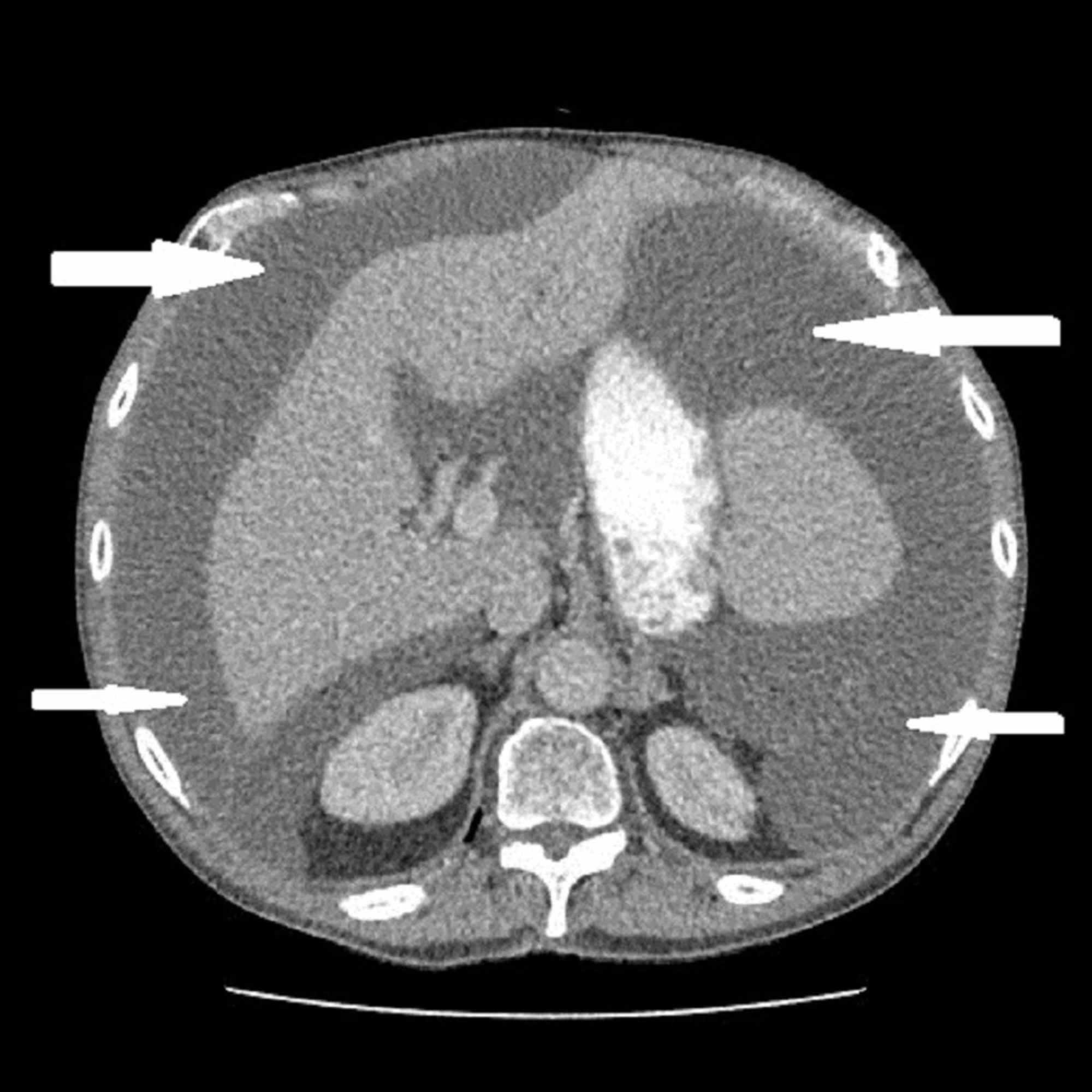 Pseudomyxoma peritonei is also referred to as 'jelly belly'. The condition is characterized by accumulation of mucinous substance in abdomen and pelvis. It usually occurs secondary to rupture of mucinous appendix tumor. Ovarian tumor may also metastasize to form similar picture. Following CT findings are usually evident: - scalloped surface of liver, spleen, and mesentery - rim-like calcifications - narrowing at ileocecal valve and pouch of Douglas - central displacement of small bowel and mesentery - thickened undersurface of the diaphragm Reference: https://learningradiology.com/notes/gunotes/pseudomyxomacorrect.htm Image via: https://www.cureus.com/articles/21402-pseudomyxoma-peritonei-secondary-to-a-primary-appendix-tumor-a-belly-full-of-jelly
