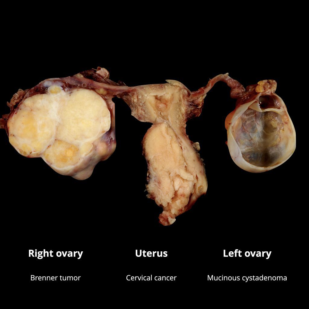 Brenner tumor is an ovarian tumor. These are usually benign, Few cases may be malignant. Brenner tumor mostly commonly occur after menopause. Due to their asymptomatic features, these tumors are found incidentally in 90% of the cases. Brenner tumor has good prognosis. Reference: https://rarediseases.info.nih.gov/diseases/9397/brenner-tumor-of-ovary/cases/23915 Image via: https://radiopaedia.org/cases/cervical-cancer-and-brenner-tumour-gross-pathology-1?lang=gb