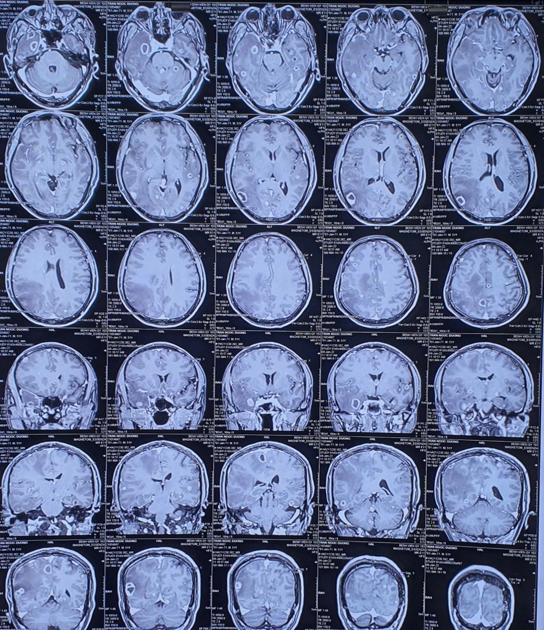 We see multiple ring enhanced lesions in this MRI Which has a long list of differential diagnoses most importantly among them are: -multiple pyogenic abscesses (in context of bacterial endocarditis) -opportunistic parasitic and fungal infections ( in context of immunodeficiency syndrome such as AIDS). Toxoplasmosis, Nocardia abcessess and…. - multiple brain metastases ( lung , breast, GI, GU, melanoma ….) -lymphoma( primary or secondary) - less commonly multiple glial tumors.