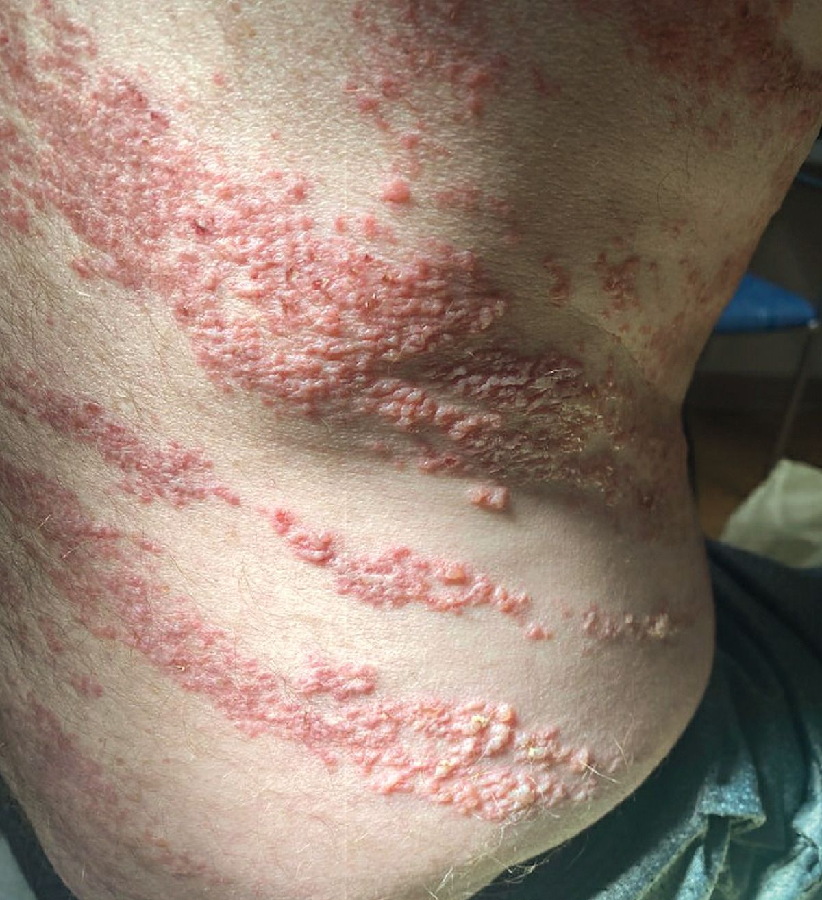 A 69-year-old man presented to the dermatology clinic with a 1-week history of an itchy, burning rash on his back and right trunk. The rash appeared 2 days after he had been discharged from the hospital after prostatectomy for prostate cancer, and he reported that a similar rash had developed after he had a surgical procedure 20 years ago. He also reported having received the live varicella–zoster vaccine several years before the current presentation. Skin examination was notable for the presence of confluent, friable vesicles on an erythematous base distributed along the lines of Blaschko, without crossing the midline. A Tzanck smear showed no viral cytopathic changes, and the results of a polymerase-chain-reaction assay for varicella–zoster virus were negative. A biopsy specimen showed intraepidermal vesicles with acantholytic dyskeratosis, a finding consistent with Darier’s disease, an autosomal dominant disorder of keratinization often characterized by greasy papules on the head, chest, and body folds. The patient received a diagnosis of linear Darier’s disease, a noninherited variant that may be mistaken for shingles. A topical glucocorticoid was prescribed, and at follow-up 6 weeks later, the rash had resolved. Timothy D. McKinley, M.D. Michele Maroon, M.D. Geisinger Medical Center, Danville, PA source: nejm.org