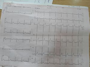 Normal sinus rhythm, hyperkalemia(peaked T waves), Left ventricular hypertrophy.