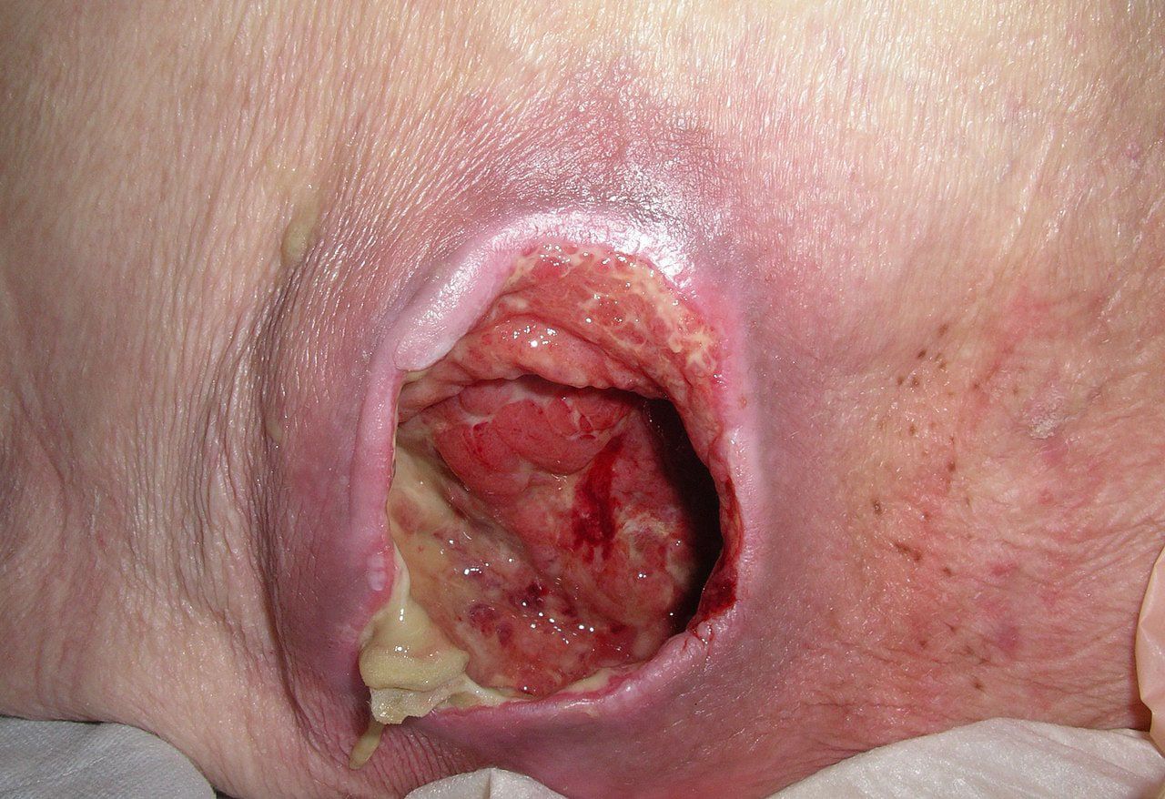 Pressure ulcers, also known as bedsores are lesions that develop under the constant pressure resulting in breakdown of skin and underlying tissue. Treatment involves relieving pressure and dressings. In severe cases, sepsis or gangrene may ensue. Reference: https://www.nhsinform.scot/illnesses-and-conditions/skin-hair-and-nails/pressure-ulcers#:~:text=Pressure%20ulcers%20can%20be%20caused,layer%20of%20the%20skin%20(epidermis) Image via: https://www.mayoclinic.org/diseases-conditions/bed-sores/symptoms-causes/syc-20355893#:~:text=Bedsores%20%E2%80%94%20also%20called%20pressure%20ulcers,%2C%20ankles%2C%20hips%20and%20tailbone.