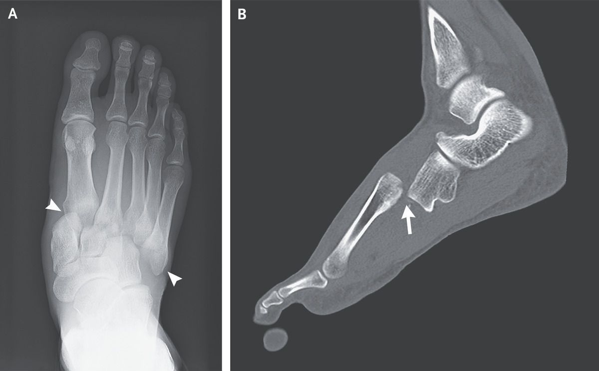 A 34-year-old man presented to the emergency department with sudden onset of pain in his right foot after landing a jump during a handball game. On physical examination, there was swelling and bruising on the dorsum of the right foot, and the patient was unable to bear weight on the foot. Non–weight-bearing radiographs showed lateral displacement of the first through fifth metatarsal bones from the cuneiform bones and the cuboid (Panel A, arrowheads). Computed tomography of the right foot revealed lateral and dorsal dislocation of the first through fifth metatarsal bones from the cuneiforms and cuboid (Panel B, arrow), as well as fractures of the first and second proximal metatarsals. The patient received a diagnosis of Lisfranc injury — an injury to the tarsometatarsal joint complex that can range in severity from soft-tissue damage to fractures with displacement. Lisfranc injuries are rare and may be misdiagnosed owing to subtle findings on radiography or to the presence of other, distracting injuries. The presence of substantial foot pain after even minor trauma should arouse suspicion for this condition. The patient underwent immediate surgical repair without complications. At follow-up 10 weeks after surgery, he could fully bear weight on the foot, and at follow-up 6 months later, his gait was normal. Hiroyuki Funatomi, M.D. Akira Kuriyama, M.D., M.P.H., Ph.D. Kurashiki Central Hospital, Okayama, Japan