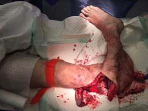 This is a traumatic below-knee amputation of the right lower limb following a road traffic accident. Unfortunately, these injuries remain common, particularly following explosions and motor vehicle accidents, and, in addition, many survivors require primary amputation for unsalvageable injuries or to save their life. Notice that a thigh tourniquet was applied to control bleeding at the field before arriving to the emergency department for surgery. Further exploration revealed that all major nerves and vessels supplying the foot had been severed. The decision was then made to proceed with a formal, below-knee surgical amputation. The limb was then covered with a soft dressing, and the knee was held in full extension with a long leg splint that supported the distal end and secured the knee anteriorly and posteriorly. It was then primarily closed following debridement of any residual necrotic tissue and foreign materials. The quality of the soft tissue envelope of the residual limb is important, as this provides the comfort and durability needed for prosthetic tolerance and weight-bearing. A painful, non-healing, residual leg secondary to inadequate soft tissue cover will markedly worsen physical disability.