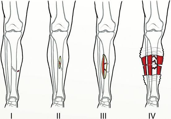 Tscherne classification soft tissue injury associated with closed fracture. There are 4 types: Type 1: no to mild tissue injury Type 2: injury to skin and muscle with intact bone covering Type 3: injury to skin and muscle with stripping of periosteum Type 4: severe tissue injury associated with crush injury, communited fracture, Morel-lavallee lesion Reference: https://link.springer.com/chapter/10.1007/978-1-4471-6572-9_110 Image via: https://link.springer.com/chapter/10.1007/978-1-4471-6572-9_110