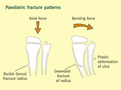 Greenstick fracture and torus fracture are common pediatric fractures. The fracture in which fracture line does not pass through the entirety of the bone due to less brittle and soft nature of the bone is called greenstick fracture. It occurs due to force on the side of the bone. Torus fracture aka buckle fracture refers to compression of metaphysis. It occurs when force is applied on the axial aspect of the bone. Reference: Boards and Beyond Image via: https://activatephysiotherapy.com.au/greenstick-buckle-fracture/