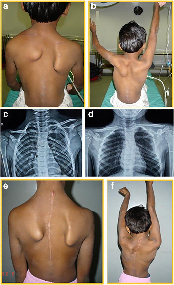 Sprengel shoulder is a congenital deformity of the scapula characterized abnormal connection between the cervical spine and the scapula. The connection may be formed by omovertebral process, fibrous band, or a bony bar. The individual presents with higher, rotated, and smaller scapula. The patient may have other associated conditions such as cardiovascular disorders, scoliosis, or abnormalities of thorax, thoracic or cervical spine. Reference: Bailey and Love's Short Practice of Surgery Image via: https://link.springer.com/article/10.1007/s00264-020-04560-7