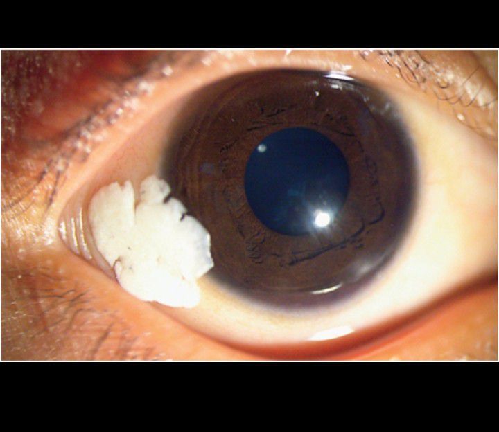 The ocular findings were consistent with Bitot’s spots, which are accumulations of keratin, often intermixed with an overgrowth of Corynebacterium xerosis, that result from epithelial metaplasia caused by vitamin A deficiency. Vitamin A deficiency can also cause blindness, as a result of corneal ulceration with scarring, and particularly night blindness, as a result of dysfunction of rod photoreceptor cells. In this patient, the serum vitamin A level was 16.8 μg per deciliter (0.59 μmol per liter) (reference range, 20 to 40 μg per deciliter [0.70 to 1.40 μmol per liter]), and the retinol-binding protein level was 0.01 g per liter (reference range, 0.03 to 0.06). Further history taking revealed extreme poverty, and further examination showed signs of dietary deficiency, with no evidence of intestinal parasites. The patient received an oral dose of vitamin A, which was repeated 4 weeks later. Artificial tears were also administered. The Bitot’s spots abated, although they did not completely resolve, over the course of 12 weeks. The parents were advised to administer another dose of vitamin A every 6 months until the child was 5 years of age.