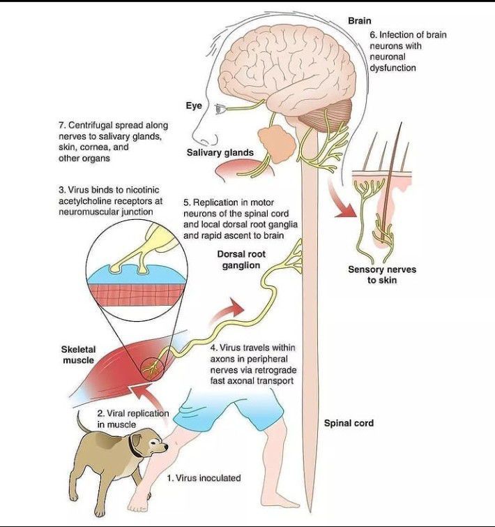 The figure shows how virus gets inoculated into the body and the pathogenic process takes place. In the given diagram you can see a dog biting the man from where the virus enters the body, replicates in the muscles (Skeletal), binds to nicotinic receptors in the neuromuscular junction , travels within the axon in peripheral nerves, Replicates in the motor neuron and dorsal root ganglia from where it infects the brain causing neural dysfunction leading to the spread along nerves to salivary gland, skin, cornea etc.