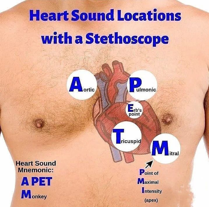 The 5 points of auscultation of the heart include the aortic, pulmonic, tricuspid, and mitral valve as well as an area called Erb’s point, where S2 is best heard. The five points of auscultation of the heart center around the heart valves and allow the listener to hear detailed mechanics of each heart valve. To listen to the aortic area, the stethoscope is placed on the right side of the sternum (i.e., the breastbone located in middle of the chest) at the 2nd intercostal space (i.e., the space between the first and second ribs). The pulmonic area is located on the left side of the sternum at the 2nd intercostal space and Erb’s point is located on the left side at the 3rd intercostal space (i.e., the space between the second and third ribs). To listen to the tricuspid area, the stethoscope is placed on the lower left sternal border at the 4th intercostal space (i.e., the space between the third and fourth ribs). Lastly, to listen to the mitral area of the heart, the stethoscope is placed at the apex of the heart, or the area on the left side of the sternum at the 5th intercostal space (i.e. the space between the fourth and five ribs) on the midclavicular line.