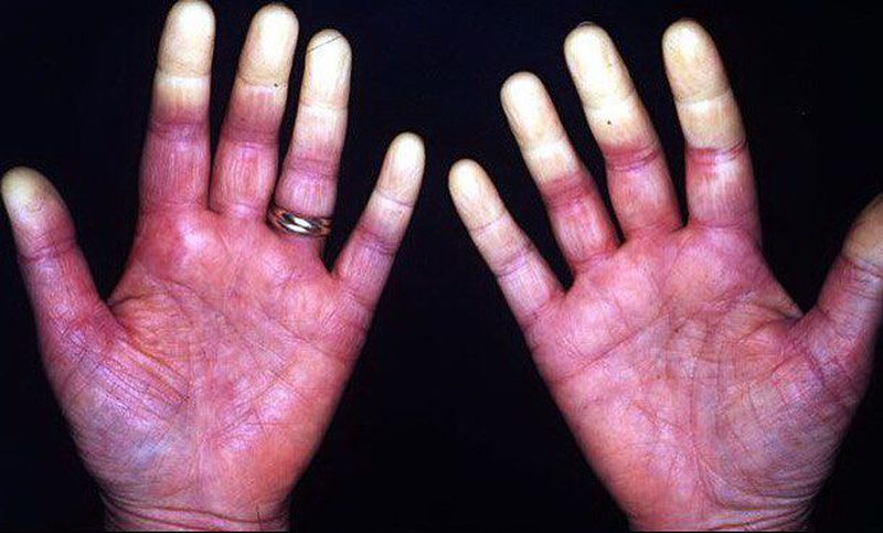 It is essentially a vasospastic disorder causing discoloration of the fingers, toes, and occasionally other extremities. The cause of the phenomenon is unknown,but it is a disorder characterized by cold or stress-induced hyperreactivity of the digital arterial smooth muscle, leading to episodic vasospasm in the fingers and toes, the body parts that are usually most susceptible to cold injury. Subsequently, it is the cause of finger ischemia that typically progresses from pallor (due to vasoconstriction) to cyanosis to erythema (red due to rapid blood reflow), and accompanied by pain. In the image, a clear line of demarcation exists between the ischemic and unaffected areas. These effects are reversible, and they must be distinguished from irreversible causes of ischemia such as vasculitis or thrombosis. Rarely, tissue necrosis occurs distal to the affected vessel, usually in the periphery of the vasculature. Drug treatment is normally with a calcium channel blocker, frequently nifedipine to prevent arterioconstriction. Patient education is the cornerstone of management, with patients being advised to avoid cold exposure, maintain the warmth of the whole body (i.e. not just wearing gloves and socks), cease smoking, avoid sympathomimetic medications, and avoid emotional stress where possible.