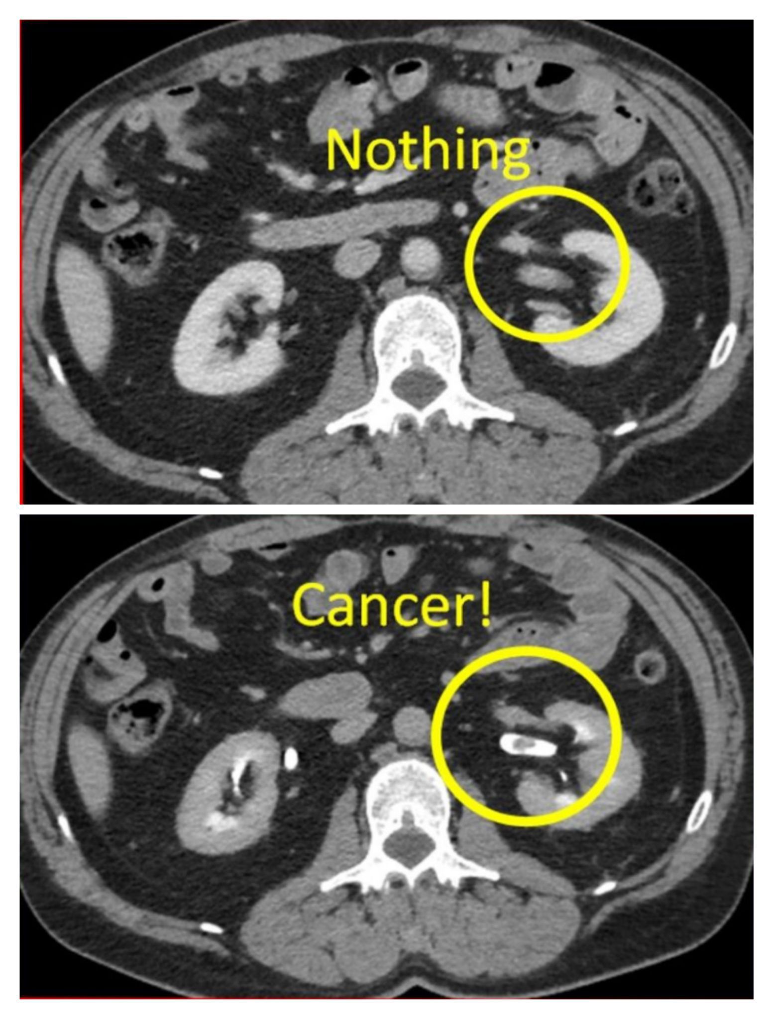 Transitional cell carcinoma- Nephrographic phase CT shows no abnormality in the left kidney collecting system. . . Pyelographic phase CT shows an oval soft tissue mass in the collecting representing a transitional cell carcinoma. . . If we only had the standard nephrographic phase image we would have missed this cancer! That’s why it is so important to do a CT urogram whenever there is hematuria. . . Transitional cell carcinoma is the most common primary malignancy of the urinary tract and may be found along its entire length (renal pelvis to the bladder). The most common presentation is hematuria. The vast majority are seen in the bladder (97%). .