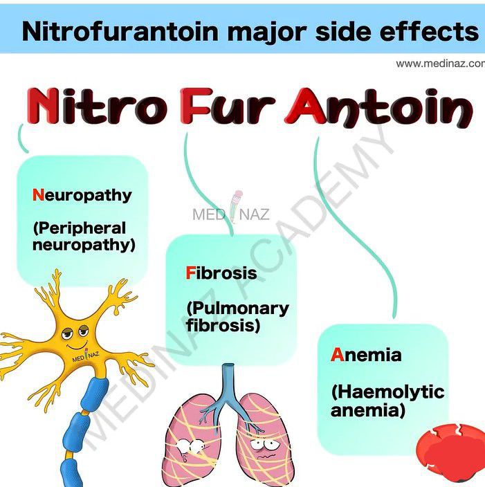 Nitrofurantoin is an antibacterial medication used to treat bladder infections, but it is not as effective for kidney infections. Here is a mnemonic for its common side effects.