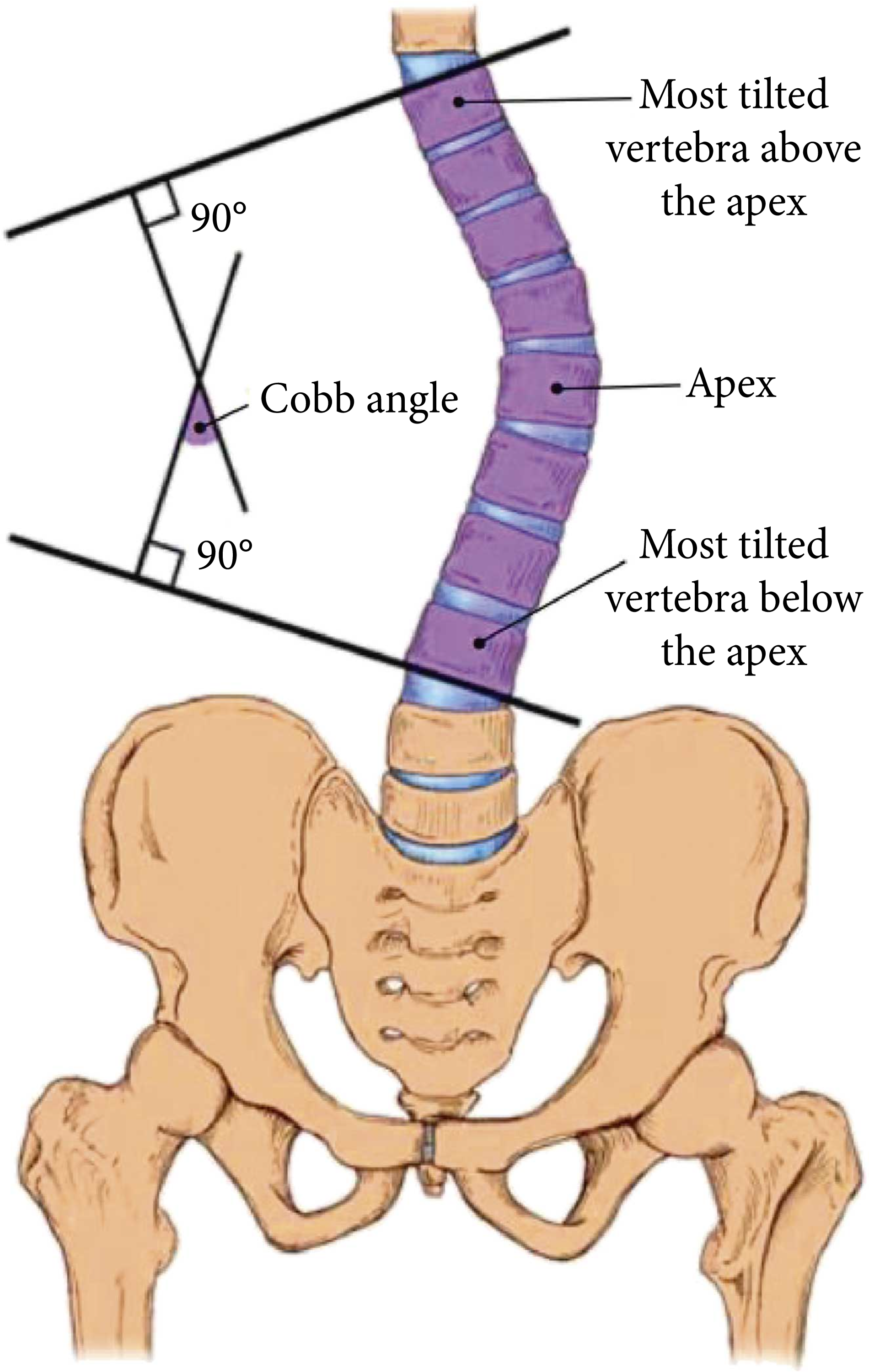 The most common quantification of scoliosis is the Cobb angle. The measurement of Cobb angle involves estimating the angle between the two tangents of the upper and lower endplates of the upper and lower end vertebra, respectively, as shown in the figure. The severity definition for scoliosis is determined using the Cobb angle. The condition of a spine is associated with the spinal curve instead of scoliosis when the Cobb angle is less than 10 degrees. A Cobb angle in the range of 10 to 20 degrees is considered as mild scoliosis. Scoliosis severity is moderate when the Cobb angle ranges from 20 to 40 degrees. A Cobb angle greater than 40 degrees denotes severe scoliosis. Source: https://www.hindawi.com/journals/cmmm/2019/6357171/