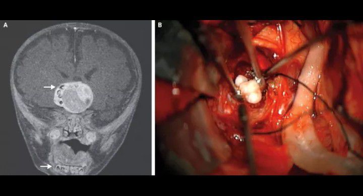It's not entirely unusual for a 4-month-old baby to have a few teeth, unless those teeth are lodged in the baby's brain. An infant in Maryland had teeth form in his brain as a result of a specific type of rare brain tumor. Doctors were able to remove the tumor and the boy made a full recovery, according to a report published in the New England Journal of Medicine in February 2014. Doctors suspected something might be going on inside the boy's brain when his head appeared to grow faster than was usual for his age. A scan of the child's brain revealed a tumor that contained what looked like teeth normally found in the lower jaw. And indeed, when doctors removed the tumor they extracted several fully formed teeth with it. While teeth do sometimes appear in tumors, the type of tumor removed from the infant's brain — a craniopharyngioma — wasn't known to host these strange additions. By: https://www.livescience.com/37919-oddest-medical-case-reports.html