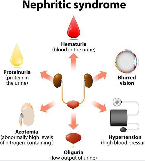 Nephritic syndrome is the name given toa collection of different signs and symptoms that occur as a result of inflammation in the kidneys. This inflammation causes the kidneys to work less effectively. It also causes protein and red blood cells to leak from the bloodstream into the urine.