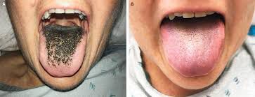 Black hairy tongue is caused by an overgrowth of dead skin cells, causing lengthening of the papillae, and staining from bacteria, yeast, food, tobacco or other substances in the mouth. Black hairy tongue is a temporary, harmless oral condition that gives the tongue a dark, furry appearance