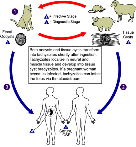 The only known definitive hosts for Toxoplasma gondii are members of family Felidae (domestic cats and their relatives). Unsporulated oocysts are shed in the cat’s feces . Although oocysts are usually only shed for 1–3 weeks, large numbers may be shed. Oocysts take 1–5 days to sporulate in the environment and become infective. Intermediate hosts in nature (including birds and rodents) become infected after ingesting soil, water or plant material contaminated with oocysts . Oocysts transform into tachyzoites shortly after ingestion. These tachyzoites localize in neural and muscle tissue and develop into tissue cyst bradyzoites . Cats become infected after consuming intermediate hosts harboring tissue cysts . Cats may also become infected directly by ingestion of sporulated oocysts. Animals bred for human consumption and wild game may also become infected with tissue cysts after ingestion of sporulated oocysts in the environment . Humans can become infected by any of several routes: Eating undercooked meat of animals harboring tissue cysts . Consuming food or water contaminated with cat feces or by contaminated environmental samples (such as fecal-contaminated soil or changing the litter box of a pet cat). Blood transfusion or organ transplantation . Transplacentally from mother to fetus . In the human host, the parasites form tissue cysts, most commonly in skeletal muscle, myocardium, brain, and eyes; these cysts may remain throughout the life of the host. Diagnosis is usually achieved by serology, although tissue cysts may be observed in stained biopsy specimens . Diagnosis of congenital infections can be achieved by detecting T. gondii DNA in amniotic fluid using molecular methods such as PCR