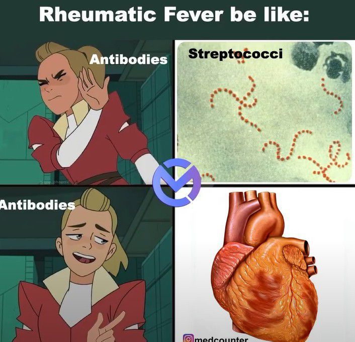 🟢Group A streptococcal (GAS) pharyngitis is the etiologic precursor of acute rheumatic fever, but host and environmental factors are important. GAS M proteins share epitopes (antigenic-determinant sites that are recognized by antibodies) with proteins found in synovium, heart muscle, and heart valve, suggesting that molecular mimicry by GAS antigens from rheumatogenic strains contributes to the arthritis, carditis, and valvular damage 🟢Cardiac involvement manifests as carditis, typically affecting the heart from the inside out, ie, valves and endocardium, then myocardium, and finally pericardium. It is sometimes followed years to decades later by chronic rheumatic heart disease, primarily manifested by valvular stenosis, but also sometimes by regurgitation, arrhythmias, and ventricular dysfunction. 🟢In acute rheumatic fever, Aschoff bodies often develop in the myocardium and other parts of the heart. Fibrinous nonspecific pericarditis, sometimes with effusion, occurs only in patients with endocardial inflammation and usually subsides without permanent damage. Characteristic and potentially dangerous valve changes may occur. Acute interstitial valvulitis may cause valvular edema. 🟢In chronic rheumatic heart disease, valve thickening, fusion, and retraction or other destruction of leaflets and cusps may occur, leading to stenosis or insufficiency. Similarly, chordae tendineae can shorten, thicken, or fuse, worsening regurgitation of damaged valves or causing regurgitation of an otherwise unaffected valve. Dilation of valve rings may also cause regurgitation. Rheumatic valvular disease most commonly involves the mitral and aortic valves. The tricuspid and pulmonic valves are seldom if ever affected in isolation. 🔴In acute rheumatic fever, the most common cardiac manifestations are