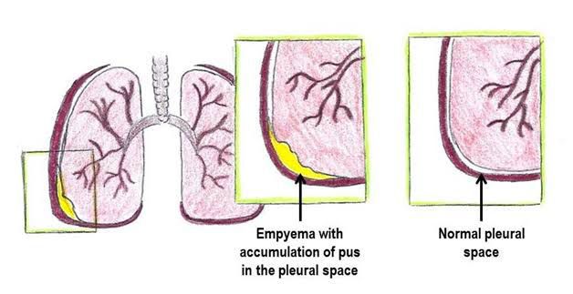 Empyema is a collection of pus in the cavity between the lung and the membrane that surrounds it (pleural space). The most common cause of empyema is pneumonia caused by a bacterial infection of the lungs. An empyema can form when pneumonia fails to fully respond to treatment in a straightforward way. Some symptoms of empyema are: Excessive sweating, especially night sweats. Fever and chills. General discomfort, uneasiness, or ill feeling (malaise) Shortness of breath.