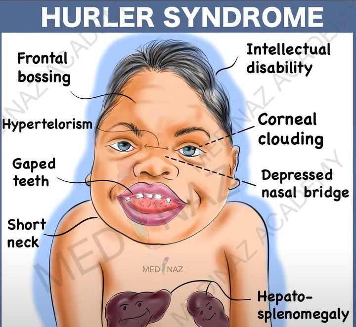 Hurler syndrome is the most severe form of mucopolysaccharidosis type 1 (MPS1; see this term), a rare lysosomal storage disease, characterized by skeletal abnormalities, cognitive impairment, heart disease, respiratory problems, enlarged liver and spleen, characteristic facies and reduced life expectancy. By: https://www.instagram.com/tv/CbbytsSDY5T/?utm_medium=copy_link
