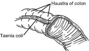 The haustra refer to the small segmented pouches of bowel separated by the haustral folds. They are formed by circumferential contraction of the inner muscular layer of the colon. The outer longitudinal muscular layer is organized into three bands (taeniae coli) which run from the cecum to the rectum.