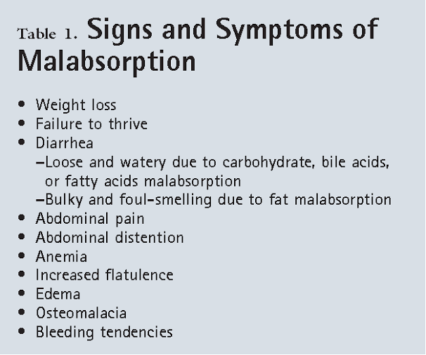 Malabsorption is difficulty in the digestion or absorption of nutrients from food. Malabsorption can affect growth and development, or it can lead to specific illnesses. Many diseases can cause malabsorption. Most often, malabsorption involves problems absorbing certain sugars, fats, proteins, or vitamins. It can also involve an overall problem with absorbing food. Problems or damage to the small intestine that may lead to problems absorbing important nutrients. When you eat a healthy meal, you expect your body to reap the benefits of the vitamins and minerals. But a condition called malabsorption syndrome means your body isn't able to take in many of the nutrients from the food you eat. This digestive problem can lead to symptoms such as bloating and diarrhea.